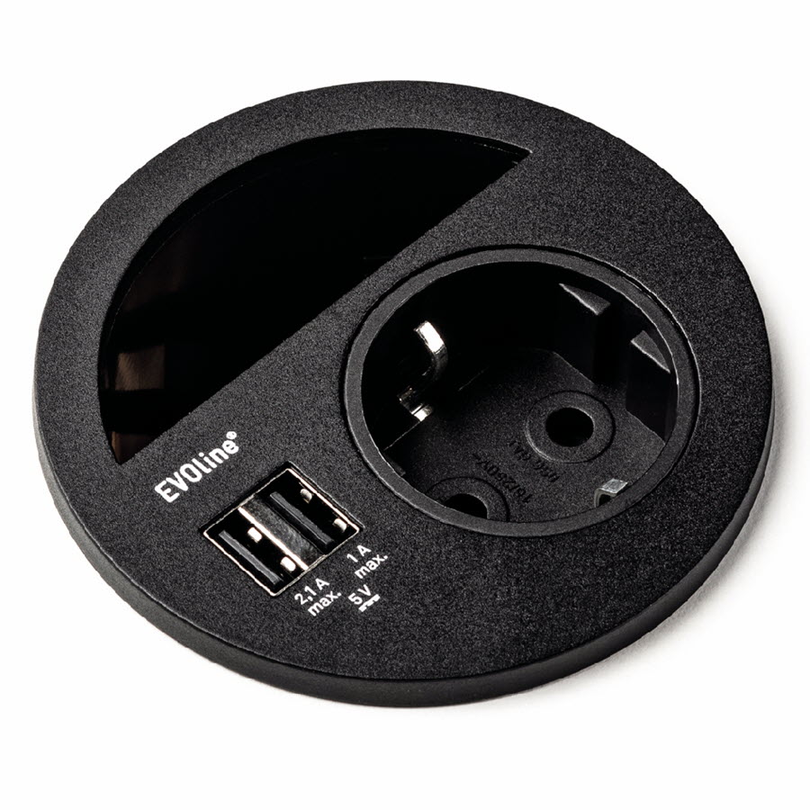 EVOline Circle80 Black, 1x power socket, double USB-A charger, very roomy cord outlet with fixation slider.